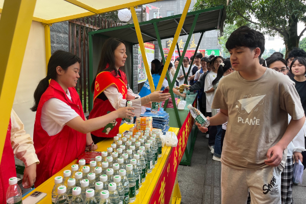 为考生发放矿泉水、文具等物资。(敖欢 摄)