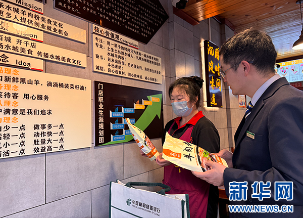 邮储银行工作人员走进店面了解经营情况。新华网发