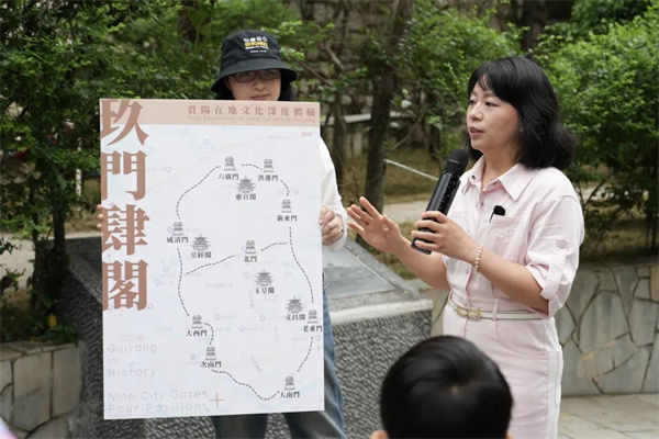 南明区文联秘书长奚婧详细讲解了贵阳市“九门四阁”历史,引领参与者沿时光长廊溯流而上。以贵阳城垣步道和贯城河为核心脉络,串联起大西门、三元宫等关键地标,生动讲述这些城市空间尘封的历史故事、兴衰变迁与建筑奥秘。