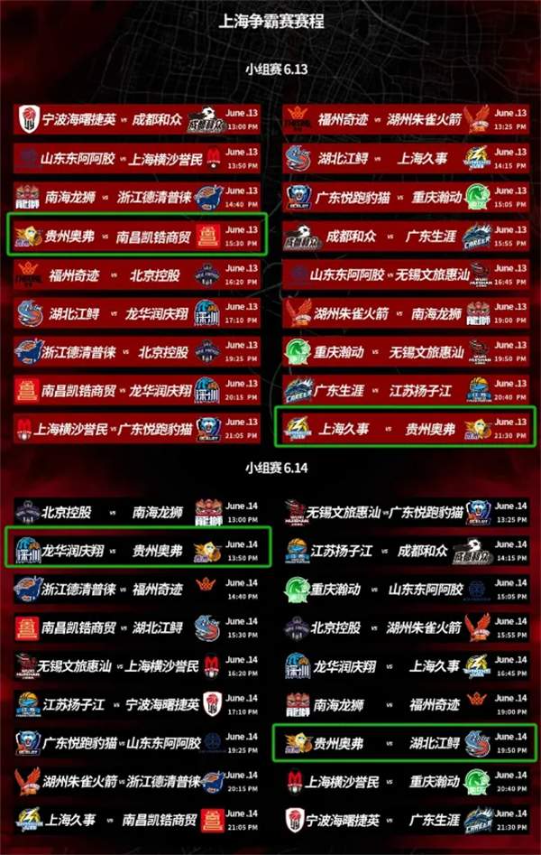 贵州奥弗分在B组,对手分别为南昌凯锆商贸、龙华润庆翔、上海久事、湖北江鲟;首场比赛将于6月13日下午3:30进行。