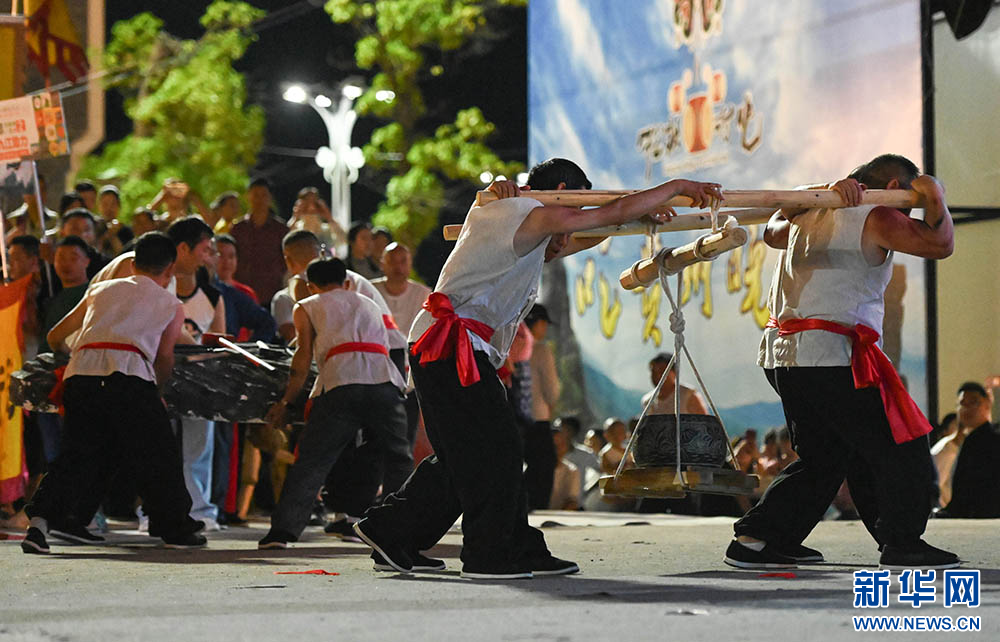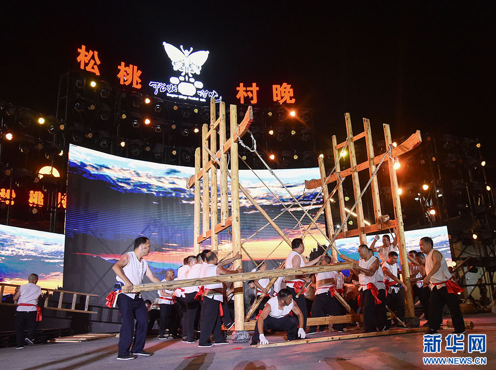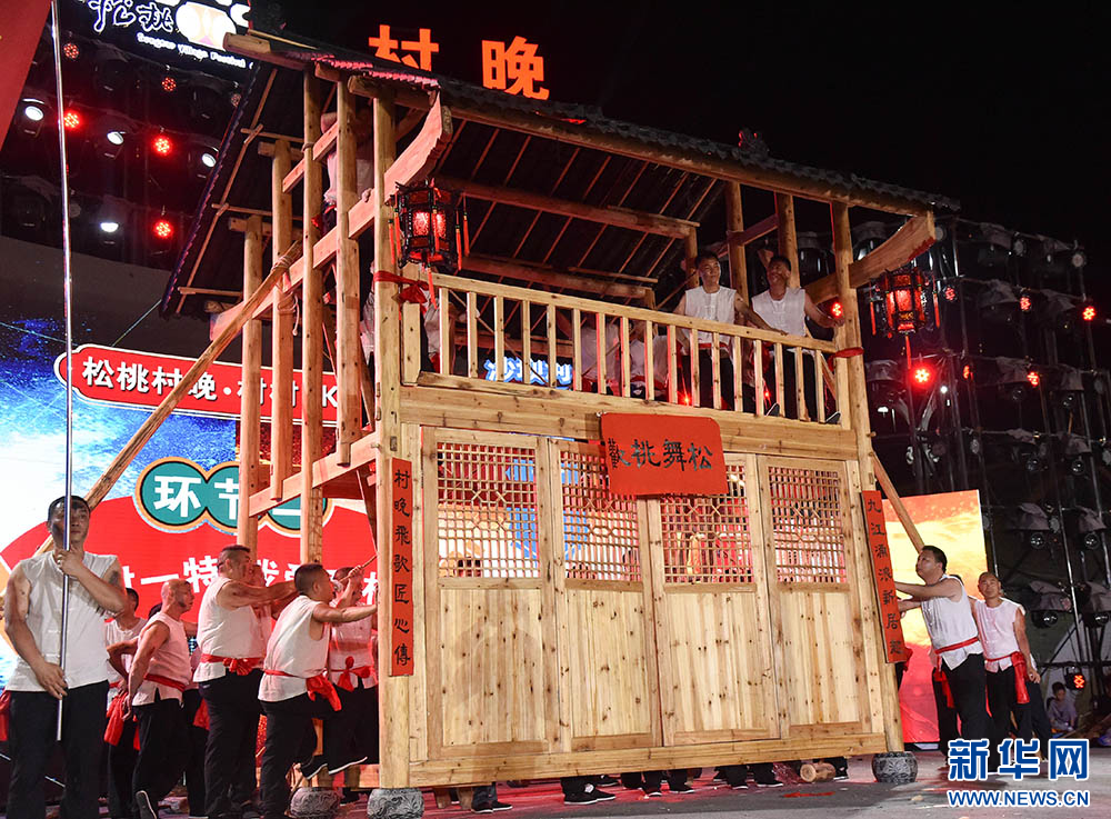 6月14日,在“松桃村晚”现场,九江街道村民抬着木料入场“立新房”。新华网发(谢慧芳 摄)