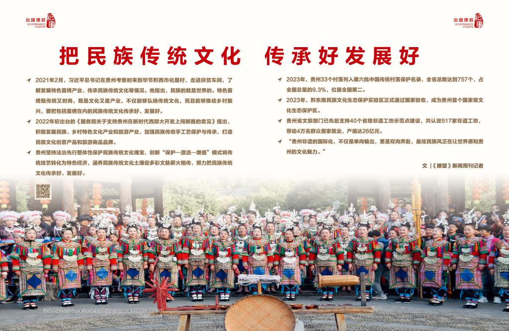 贵州不断完善民族传统文化传承发展政策法规体系:2022年出台的地方性法规《贵州省优秀民族文化传承发展促进条例》紧贴贵州实际,着重在依法推进民族文化传承发展、发挥利用好民族传统文化资源优势、助推全省经济社会高质量发展等方面作出规定。