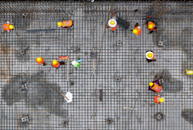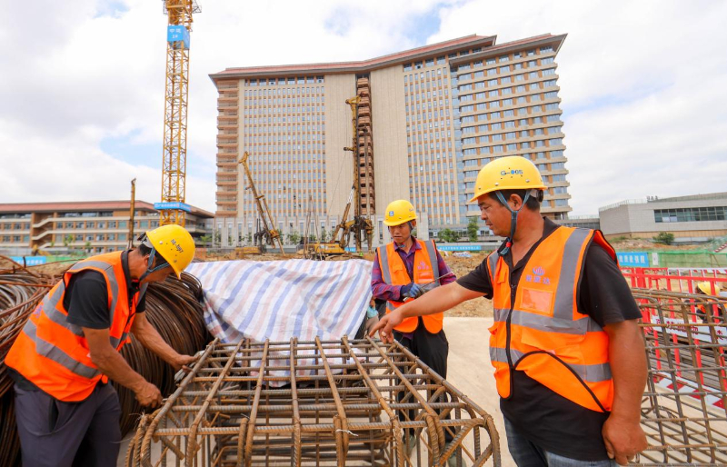 工人在贵安新区中山一院贵州医院二期项目施工现场忙碌(6月12日摄)。(袁福洪 摄)
