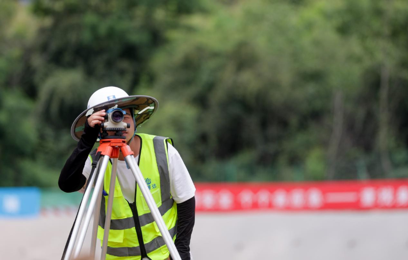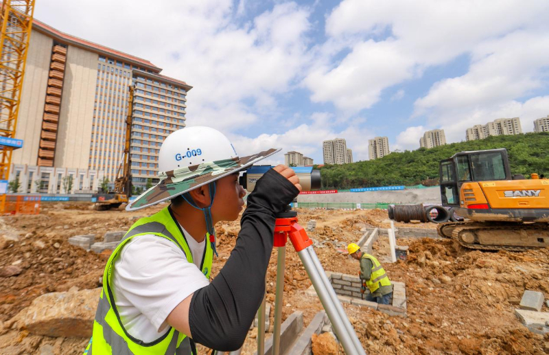 技术人员在贵安新区中山一院贵州医院二期项目施工现场忙碌(6月12日摄)。(袁福洪 摄)