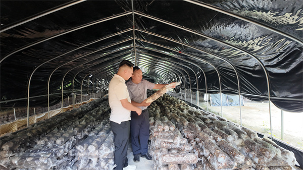后山乡田兴村党支部书记夏世江正在查看菌棒情况。