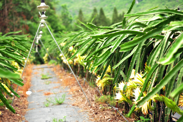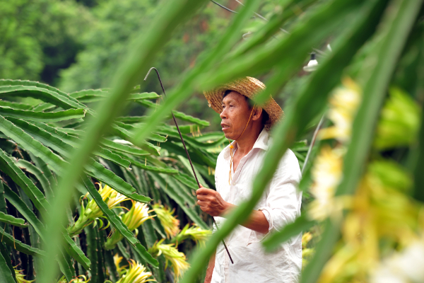 罗甸县龙坪镇板庚村种植基地里火龙果花盛开,果农田间管理忙。(班方智 摄)