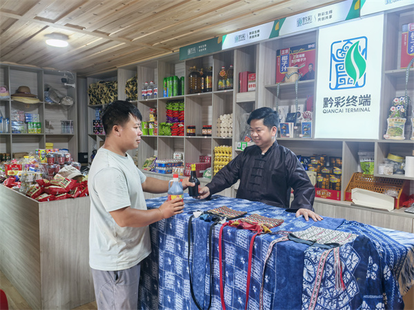 “游客就喜欢咱这民族特色,你这门口晾晒的蓝靛染布、手工雕刻的门窗,都是宝啊!不过咱这店的硬件条件有些跟不上,商品种类也比较单一,留不住客人。”榕江县烟草公司客服员的话让杨成华萌生了改造小店的想法。在烟草公司的帮扶下,他迅速行动,将老店升级为“黔彩终端”,增设邮政、包裹、银行业务代办等便民服务。改造后的小店,古香古色的原木整装,实木雕花门窗精巧细致,尽显侗族的传统韵味;透亮的玻璃柜台取代斑驳的木柜,木纹展柜上色彩斑斓的蓝染手工艺品、颗粒饱满的本地糯米、充满活力的“村超”主题礼盒,在暖黄射灯的烘托下熠熠生辉,侗族风情与地方特色在此交织碰撞,形成独特的视觉盛宴。店门口绿色的邮筒醒目地伫立在旁,门楣上,“黔彩终端”的灯箱与“农行业务代办”的标识相互辉映,简洁明快的现代商业标识与古朴温润的侗族木质建筑完美融合,既传递出便捷高效的现代气息,又彰显着民族文化的深厚底蕴,传统与现代的界限在此悄然融合,共同勾勒出小店崭新而迷人的风貌。