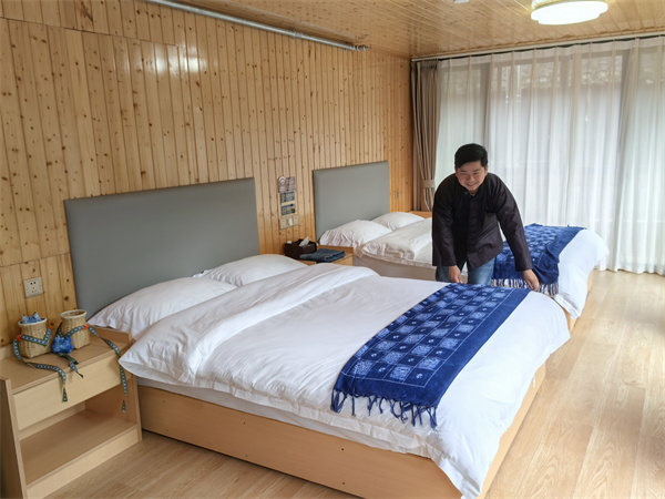 客人的话让杨成华萌生了开民宿的想法。然而,看着家中年久失修的木楼,他犯了难:装修资金从哪儿来?关键时刻,政府的乡村振兴贴息贷款政策送来了“及时雨”。凭借小店的经营流水,他顺利申请到30万元低息贷款。拿到贷款后,他立刻着手对二楼的五间空房进行改造。他特意保留了侗族传统的木构梁柱和雕花窗格,在床头摆放自己手绘的寨区导览图,把奶奶亲手纺制的侗布做成床旗,妈妈手绣的蓝染香囊作为装饰挂件。2023年暑期,“山舍民宿”正式迎客,首月入住率就达到70%。游客在留言本上写道:“躺在吊脚楼里听虫鸣,清晨跟着老板去田里摘最新鲜的蔬菜,这才是向往的乡村生活。”