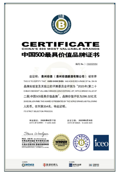 自2022年以来,贵州珍酒已连续4年入选该榜单,排名由2022年的第375名上升至2025年的第354名,品牌价值已增长67.8%,并连续蝉联榜单酱酒品牌第三名,仅次于茅台、郎酒。