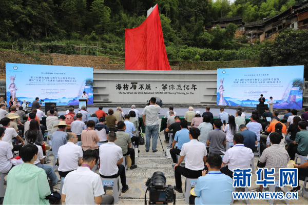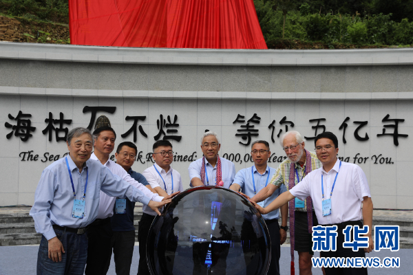 伴随着热烈的掌声,沈树忠、贵州省科技厅副厅长杨友昌、黔东南州政府副州长洪龙弟、国际学术代表霍夫曼(美国科学院院士)、国际寒武系分会选举委员杨犇、张大林、研究团队代表彭善池、陈林共同为“金钉子”揭碑。红绸缓缓落下,刻有“寒武系苗岭统和乌溜阶全球层型、剑河寒武纪化石宝库”苍劲大字的标志碑巍然矗立。