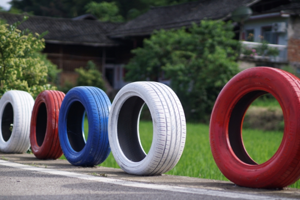 近日,笔者在贵州省黔东南州岑巩县客楼镇下寨村看到,一条由70余个色彩明艳的废旧轮胎和150米竹制护栏装点的“五彩之路”,在乡间蜿蜒铺展。