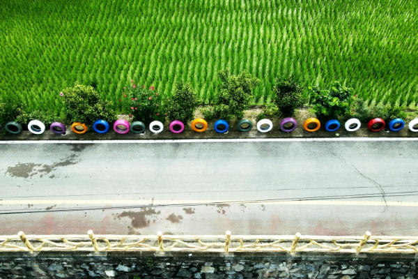 彩色轮胎错落有致地排列,宛如灵动的艺术长廊。(班福丽 摄)