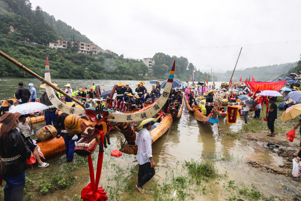 龙是苗族人民的图腾和吉祥物之一,在台江的很多大型传统节日里,都与龙元素有关。苗族独木龙舟节作为最盛大的节日之一,苗语称“掐仰勇”,通常在端午后20天,即农历五月二十五日前后举行。活动当天,苗族群众身着盛装,带着鹅、鸭、猪等礼物齐聚清水河畔,参加出龙接龙、比赛竞渡等活动,现场十分热闹。