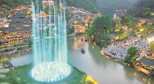 游客在遵义市乌江寨景区观看音乐水舞秀表演。袁福洪 摄