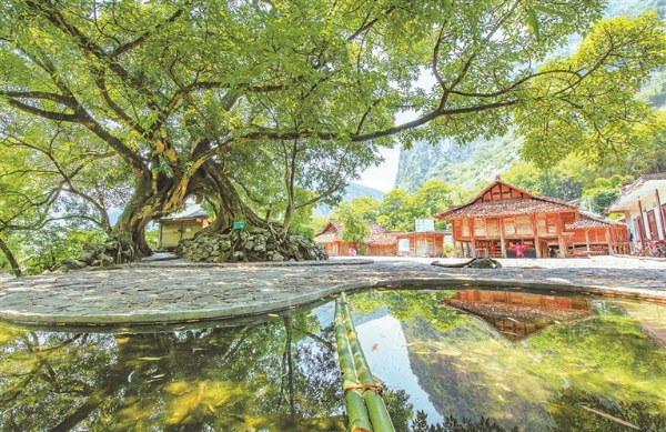 在六盘水市水城区花戛乡天门村鸭场组,“夫妻树”与布依族特色吊脚楼相映成趣。 贵州日报天眼新闻记者 尚宇杰 摄