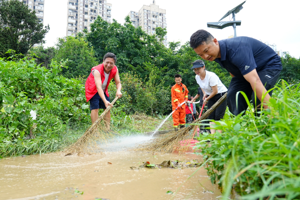 6月22日,贵州省黔东南州榕江县滨河生态体育公园,党员干部与群众一起进行清淤排涝。