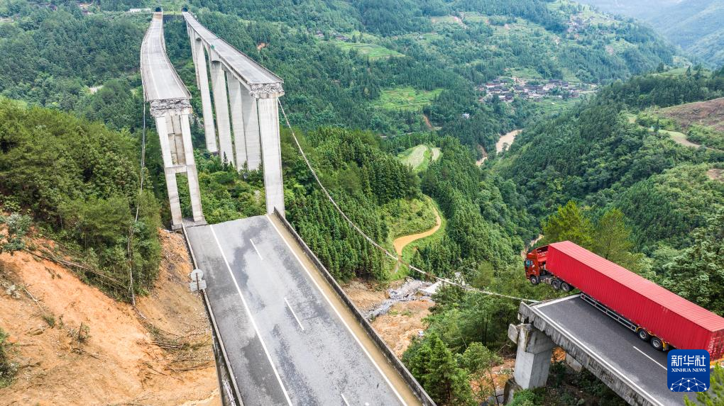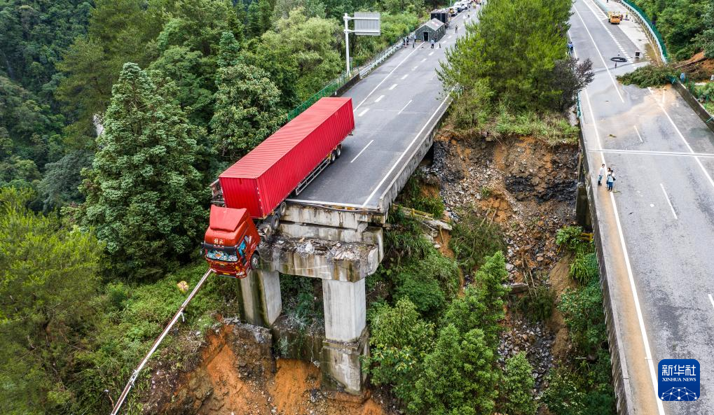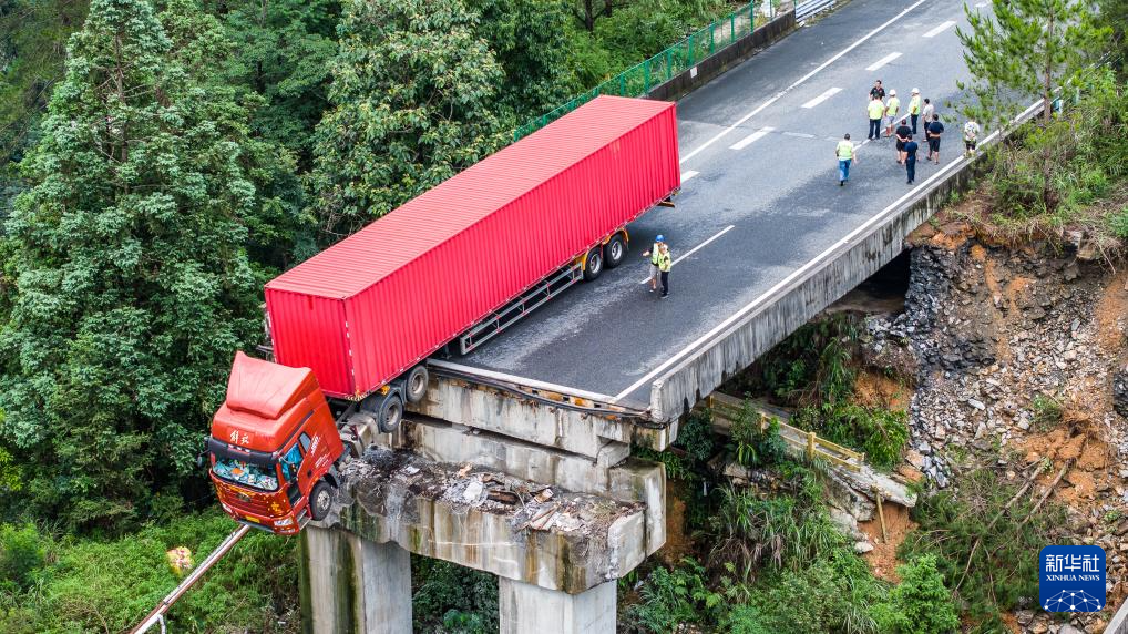 6月24日,一辆货车卡在断桥边缘,车上人员已被救出。新华社发(杜朋城 摄)
