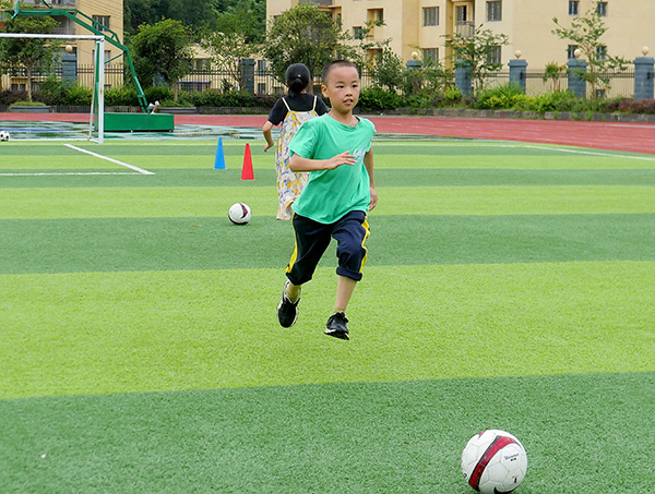 紧邻的绿色足球场上焕然一新,孩子们追逐着脚下的足球奔跑嬉戏。塑胶跑道环绕四周,鲜艳的色彩在一场夏雨后格外亮眼。四年级学生李俊泽带球前行,每一次成功的扑救或进球,眼中都跳跃着纯粹的欢喜。一旁等待训练的杨弋稀,目光紧追滚动的足球,脸上写满跃跃欲试的期待。