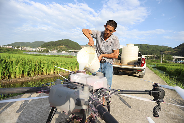 图为新农人卢华养正在使用无人机进行水稻管护。