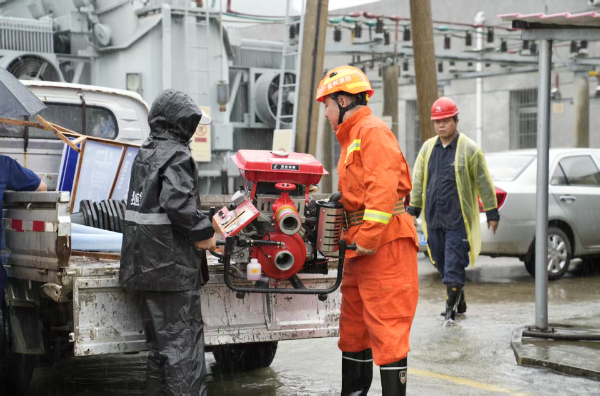 在麻尾镇,独山供电局启动联动机制,与当地政府开展应急联动,麻尾镇政府工作人员现场协调资源并组织村民开渠引流,供电局工作人员现场制定排险方案,消防人员则架设抽水设备,全力排除受影响变电站内积水。