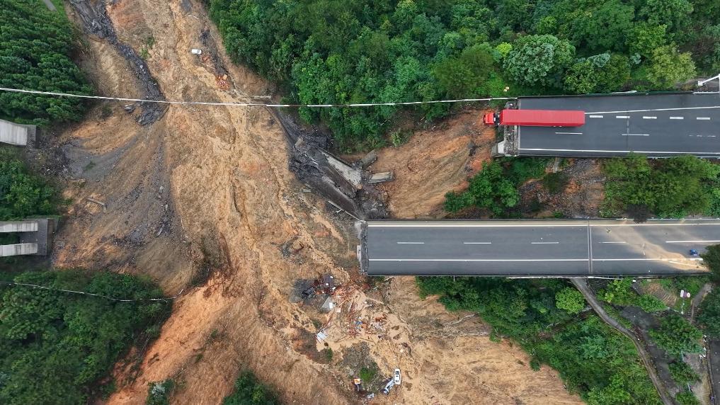 6月24日,因持续强降雨诱发山体滑坡,导致G76厦蓉高速格都线广西至贵州都匀方向K1264处猴子河特大桥引桥发生垮塌,一辆大货车悬挂在垮塌大桥的断裂处,车头已经全部掉下桥梁的路面,只有车身还停留在桥面上,情况十分紧急。事故发生后,应急、公安、消防、卫健等救援部门立即赶赴现场组织开展抢险工作。
