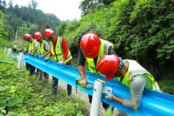 与此同时,在南寨镇绕庆村的施工现场,工人们正有条不紊地运输材料、安装防护栏杆,随着机械轰鸣声一次次响起,一段段蓝色波形梁护栏被连接起来,牢牢地“钉”在盘山路的外侧。