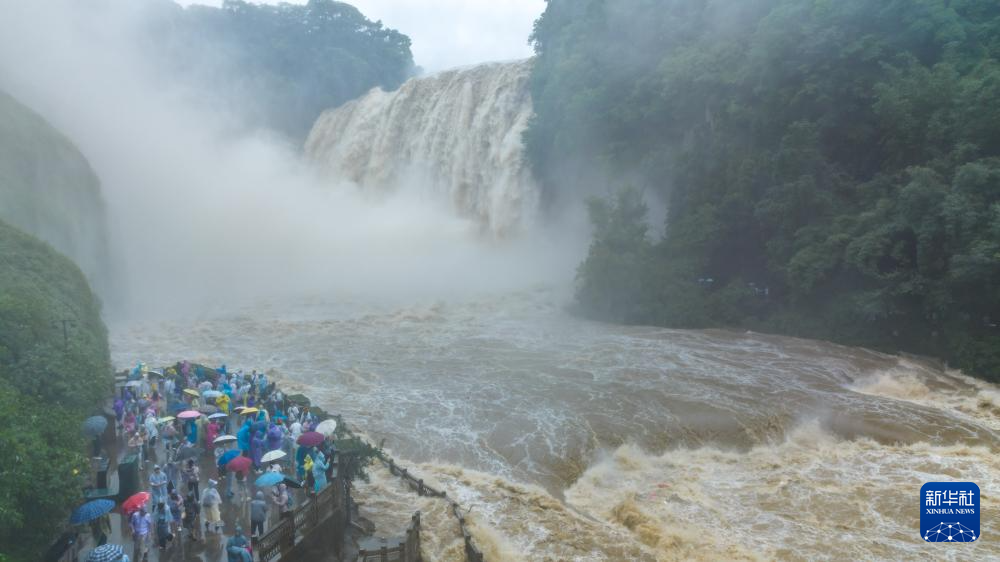 6月26日,游客在贵州省安顺市的黄果树瀑布游览(无人机照片)。