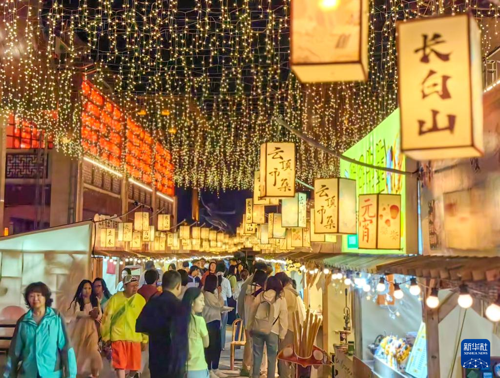 夜幕降临,吉林长白山脚下的二道白河镇,云顶市集灯火璀璨、人潮涌动。500米长的商业文化街区两侧,60余家美食与长白山特色文创摊位依次排开。游客品美食、逛夜市,感受长白山夏夜的独特魅力。