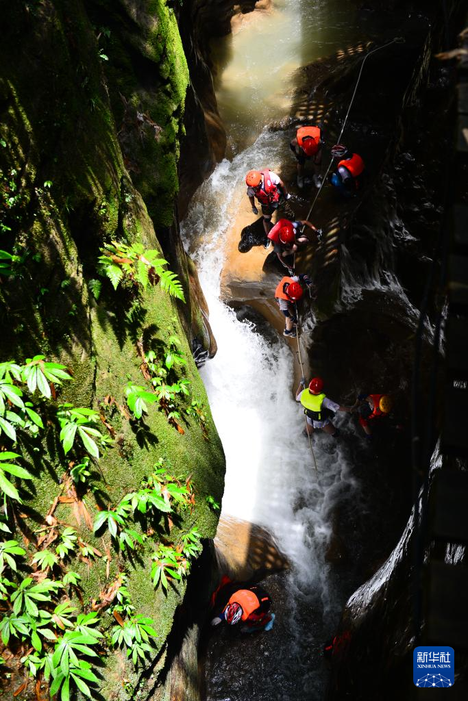 位于重庆市北碚区的金刀峡景区是一条全长约10公里的幽静峡谷,景区依托生态条件,打造了特色溪降运动。“溪水拍打身体,带来阵阵透心凉意,让人更好地放松。”重庆市民赵锐说。