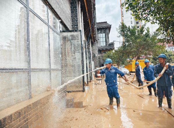 在现场,抢修队员肩并肩、脚抵脚,紧握高压水枪,强劲的水流猛烈冲击着黏稠的淤泥,泥浆四溅。水枪的后坐力考验着队员们的体力和配合,但无人退缩,大家咬紧牙关,合力稳住水枪方向,一寸寸剥离覆盖在电力设施周边的障碍物。