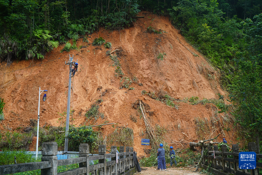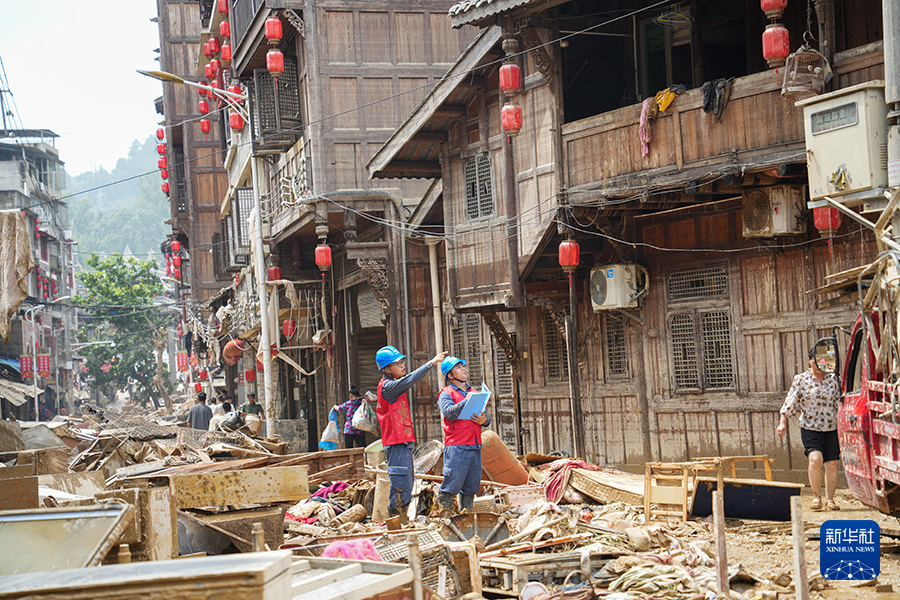 6月26日,贵州省黔东南苗族侗族自治州榕江县古州镇,南方电网贵州凯里供电局员工在开展勘灾工作。(蔡兴文 摄)