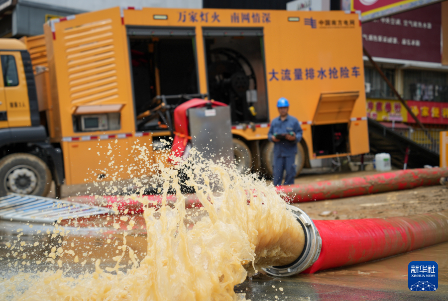 6月25日,贵州省黔东南苗族侗族自治州榕江县,南方电网抢修复电工作人员使用大型排涝车为居民小区排涝。(蔡兴文 摄)