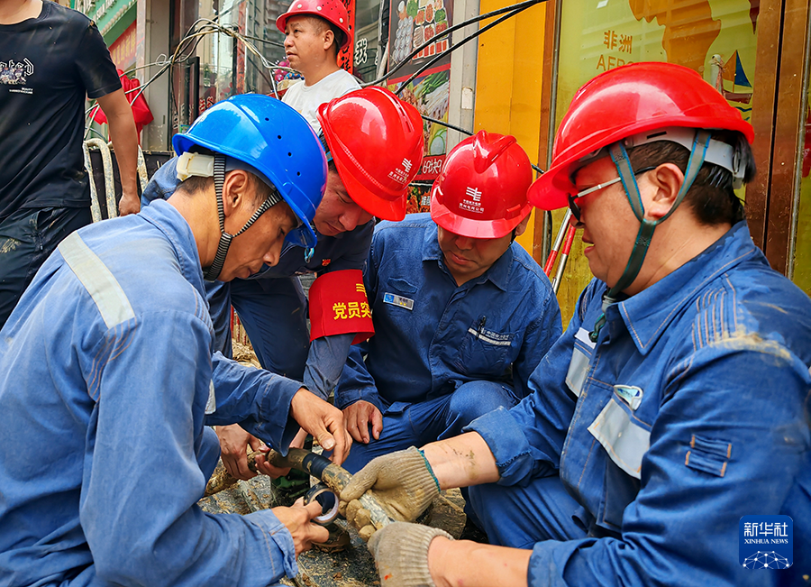 6月26日,南方电网贵州铜仁供电局抢修人员在榕江县滨江二号小区开展清淤排障作业,确保应急电源及时接入恢复供电。(杨泽昱 摄)
