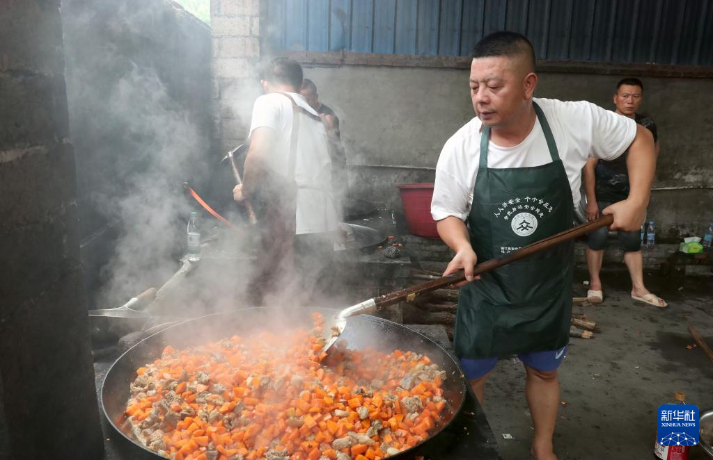 6月29日,在榕江县古州镇口寨社区一后勤伙食保障点,党员阙江勇在炒菜。新华社发(李长华 摄)