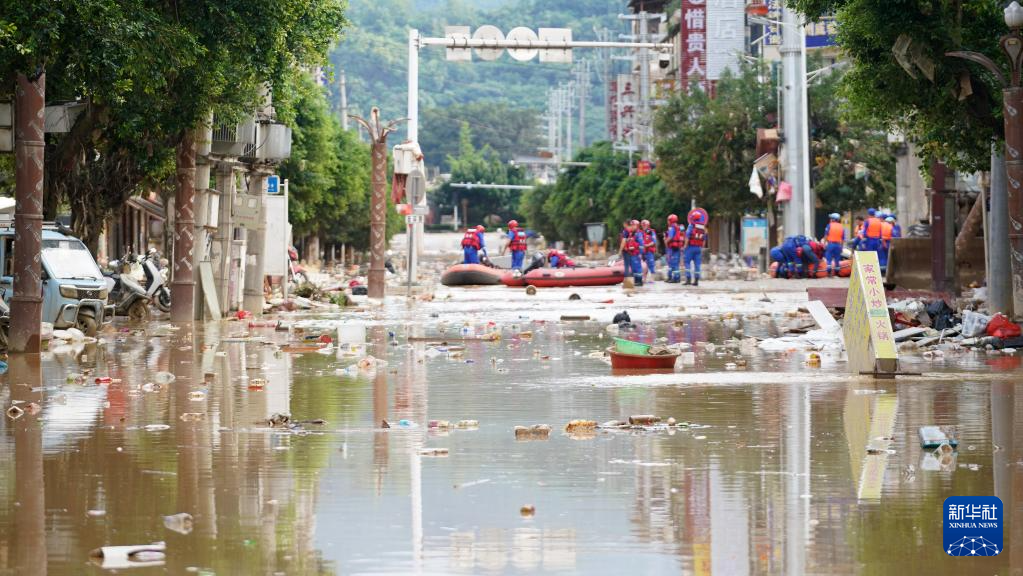 6月28日,救援人员帮助榕江县城内居民撤离。新华社记者 刘续 摄