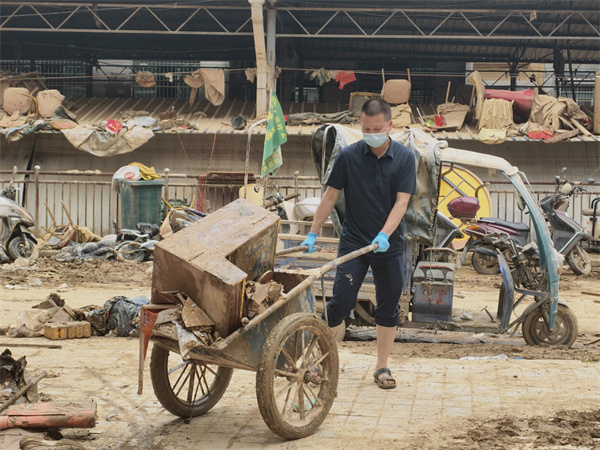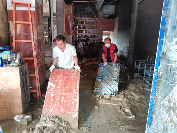 榕江县烟草专卖局(公司)志愿者正在帮助零售客户清理店铺淤泥。