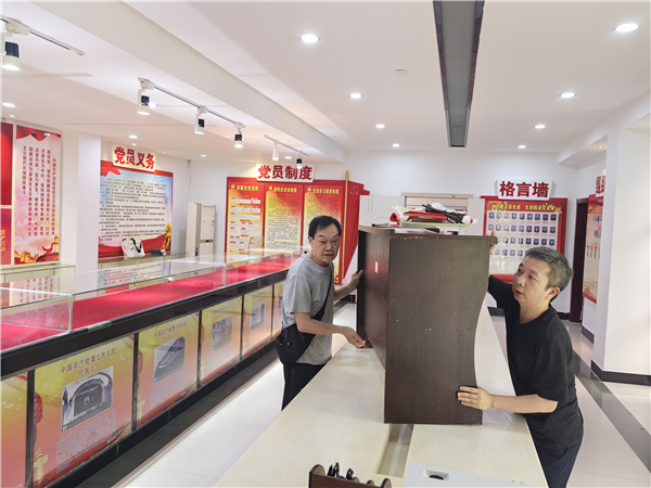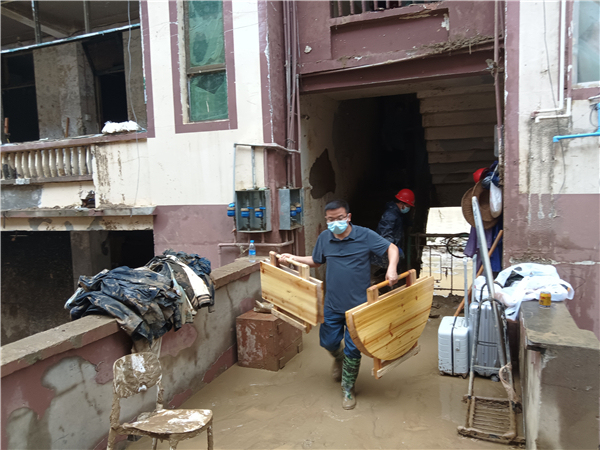 退休干部石碧玉(左一)与干部职工共同转移单位底楼物资