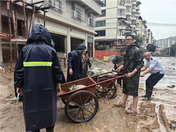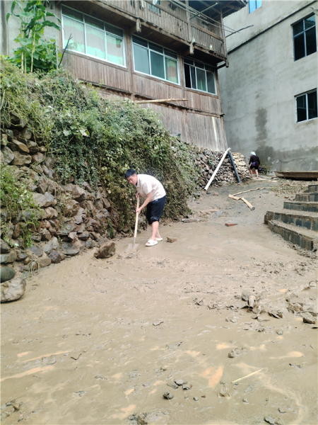 从江县税务局驻村第一书记袁振琳在洪峰过后带头开展灾后清淤工作