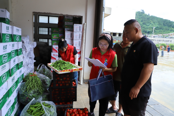在三都县应急管理局救灾物资接收点,满载着西红柿、辣椒的篮筐整齐堆放,艾培贵正与工作人员认真交接,做好登记。