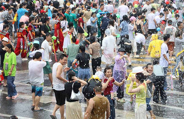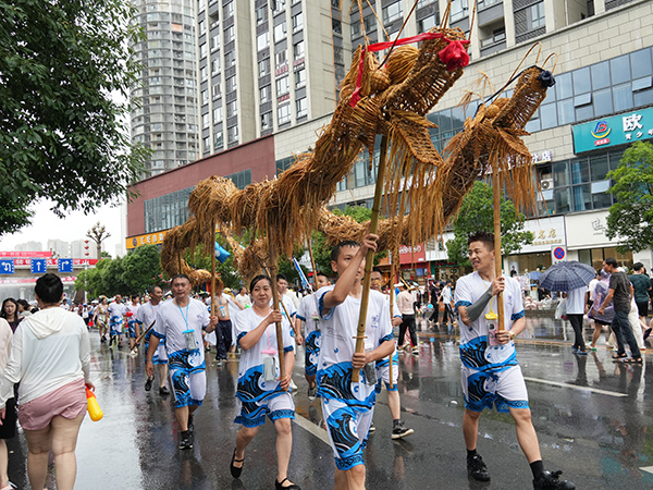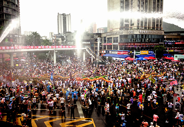 鼓声阵阵,水龙齐舞,出龙仪式现场人头攒动,热闹非凡。出龙仪式后,36条水龙游上街头接受喷水“洗礼”,市民和游客将水瓢、水盆、水枪齐上阵,你倾一瓢,我洒一盆,他喷一枪,把祈福喷向草龙,水车也前来助兴,飞溅的水花,把气氛推向高潮。