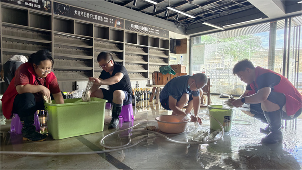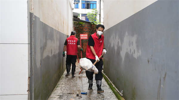 “红马甲”队员闻声停下脚步,隔着门槛喊道:“徐老板,我们来帮您清理!”他们蹲下身,避开满地狼藉,轻声说,“你看这些没碎的酒瓶,我们帮您擦干净;泡过水的酒架,也能联系师傅修复”。随着一声招呼,红马甲们迅速行动起来,踩着黏腻的泥水,小心翼翼地将破碎的酒瓶碎片装进编织袋,用抹布反复擦拭浸泡后仍完好的酒瓶……