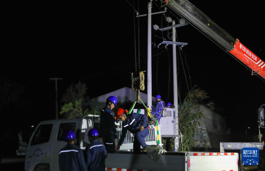 南方电网贵州凯里供电局抢修人员在榕江县兴华水族乡开展变压器吊装、更换工作。(张宇慧 摄)