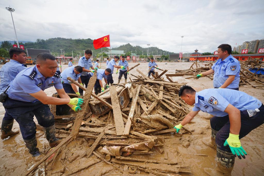 6月29日,在贵州省榕江县“村超”球场,来自丹寨县公安局的党员民警潘建航(左二)和同事一起清理因洪灾受损的球场设施。新华社发(杨武魁 摄)