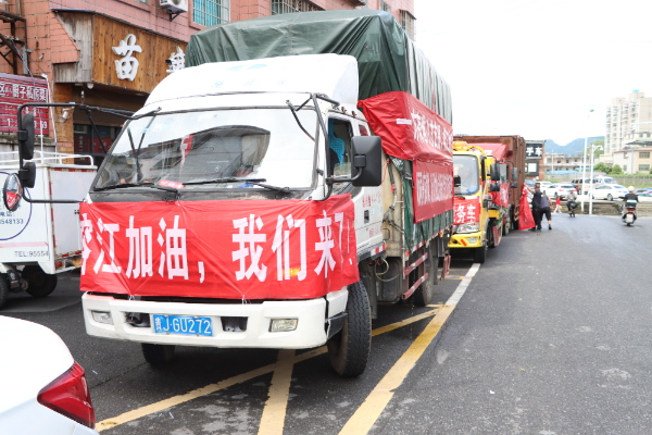 一箱箱消毒水、蚊香、方便面,一袋袋大米、纸巾、果蔬……7月2日上午,在独山县街头,4辆悬挂着“榕江加油!我们来了!”等加油口号的货车正停靠路边,车上,各类爱心物资格外引人注目。