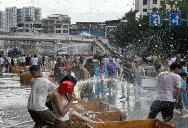 游客们在董家水井街道进行泼水狂欢