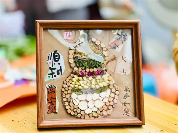 在中医药文化体验活动中,手工制作大山楂丸、炒白术,赠送中药茶饮、艾草、菖蒲、香囊,为小朋友朱砂点红人气火爆。运用槟榔、血藤、栀子等中药材设计出的耳环、项链、手链和冰箱贴等产品销售一空。