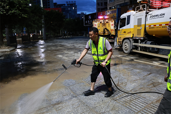 “2号下午刚进县城时,部分路段淤泥厚度达十几厘米,车辆通行困难,有的还得绕行临时便道。”队员雷邦永站在滨江大道上说道。为尽快恢复道路畅通,救援队伍迅速行动,调配4台清扫车、2台清洗车,兵分多路,奔赴县城滨江大道、县人民法院、和谐世纪城、富民小区等受灾区域,采用“机械+人工”协同作业模式,争分夺秒对路面展开清扫。