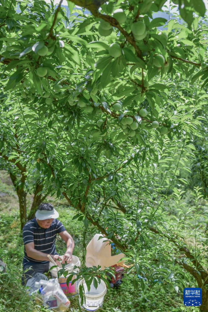 2025年7月3日,果农在贵州省铜仁市沿河土家族自治县沙子街道十二盘村果园中劳作。新华社发(陈晓岚 摄)
