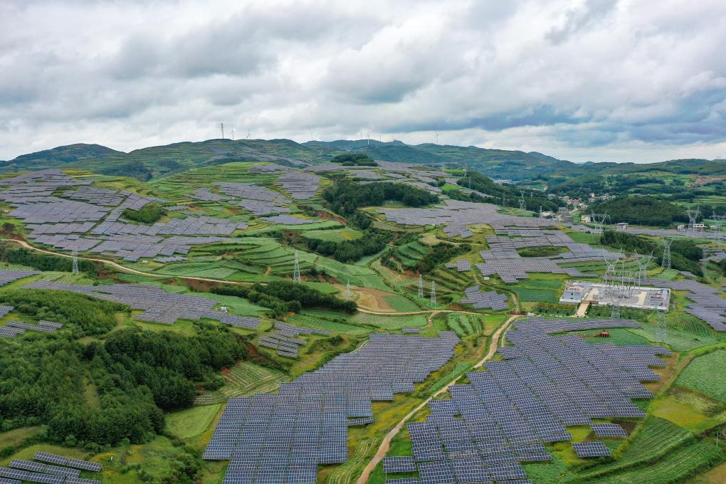 6月24日,贵州省威宁县双龙镇高山村的仙水窝农业光伏电站,满山蔚蓝的光伏板错落有致。