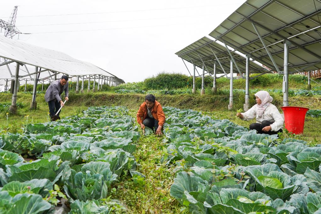6月24日,贵州省威宁县双龙镇高山村的仙水窝农业光伏电站,务工群众在对光伏板下的蔬菜进行管护。